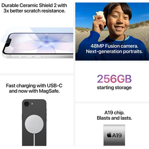iPhone 17e features a beautiful 6.1-inch Super Retina XDR display, the fast and capable A19 chip, all-day battery life and 256GB starting storage.