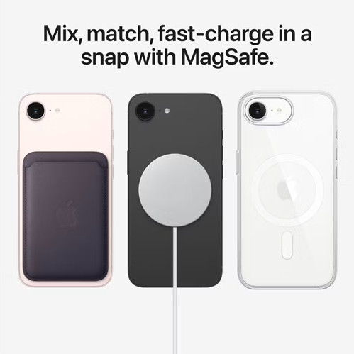 FAST WIRELESS CHARGING. ALL IN A SNAP WITH MAGSAFE — iPhone 17e lets you charge wirelessly up to 15W, compared to 7.5W with iPhone 16e. That means when you need to charge, it’s easy, convenient and fast.