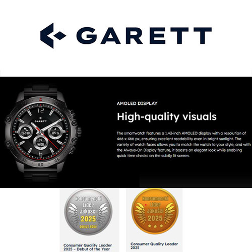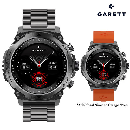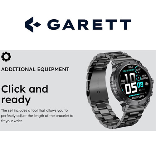 • What’s in the box: GARETT smartwatch, additional silicone strap, bracelet adjustment tool, charging cable, QSG manual