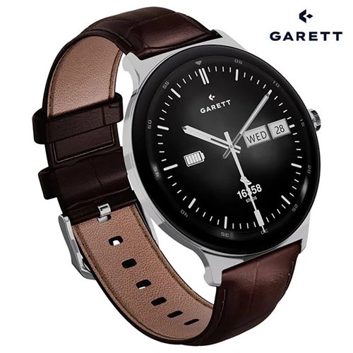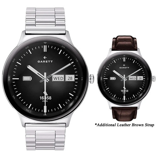 • What’s in the box: GARETT smartwatch, extra black leather strap, USB charging cradle, adjustment tool for the stainless steel bracelet & QSG manual