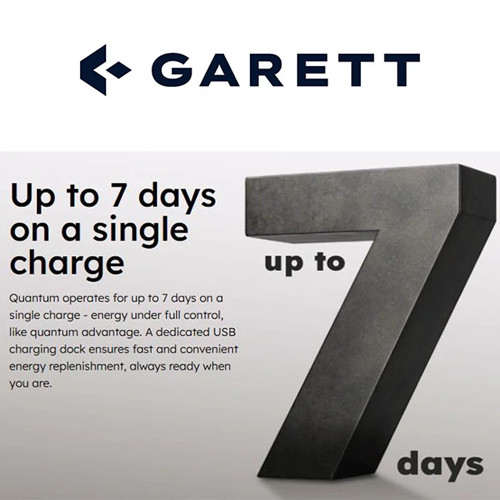 Garett Quantum works continuously for up to a week, and when it needs to be recharged, the practical USB stand allows you to do it easily and effortlessly.