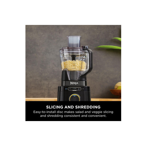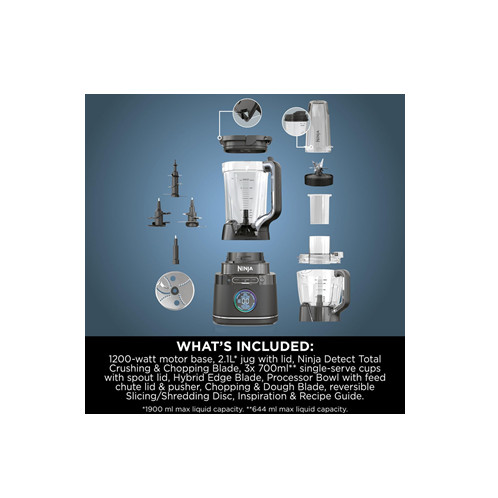- Includes: 1200W motor base, 2.1L* jug, 1.8 Food Processor Bowl**, 2x 700ml Single-serve cups***, Ninja Detect Total Crushing & Chopping Blade, Chopping Blade, Dough Blade, Slicing/Shredding Blade, Hybrid Edge Blades & Recipe Guide